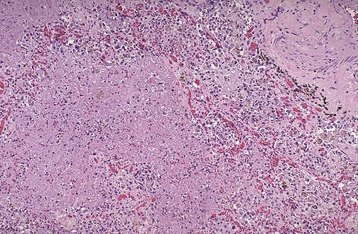 Este abceso posee una mezcla de células inflamatorias, pero la pared del abceso se está "organizando" con fibroblastos y generación de neovasos (angioblastos forman capilares) .