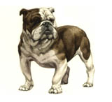 Características La alzada oscila alrededor de 35 cm y el peso debe ser de 25 kg en los machos y algunos menos para las hembras. La cabeza es enorme con cráneo muy ancho y esteroidal de amplias mejillas, que superan con mucho los lados de los ojos. El hocico muy corto, tiene mandíbulas poderosísimas con evidente prognatismo (la mandíbula sobresale por delante del maxilar superior). Los ojos, bastante bajos y muy separados, son redondeados, de color negro o pardo oscuro y se engastan alrededor de párpados caídos de expresión sumamente característica entre "triste" y "feroz". Las orejas, pequeñas, finas, de nacimiento alto, se pliegan dejando ver parte del lóbulo interno. El cuello, corto muy ancho, presenta papada lateral doble que llega hasta el pecho amplio de tórax muy potente con costillas abarriladas y línea dorsal convexa; "de carpa" con grupa muy elevada. Las extremidades anteriores son cortas verticales, muy vigorosas terminando en pies anchos de dedos fuertes y arqueados. El par posterior tiene muslos poderosos de gran musculatura y corvejones próximos al suelo ligeramente "vueltos" hacia fuera. La cola, naturalmente corta, es gruesa en la base y se afina en la punta estando replegada junto a las nalgas generalmente baja. El pelaje, corto liso, fino y suave, puede presentarse en tonos rubios o leonados con máscara negra en la cara o manchas blancas. Se admite también el blanco manchado.